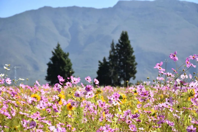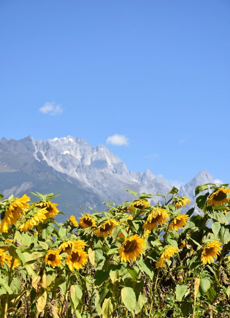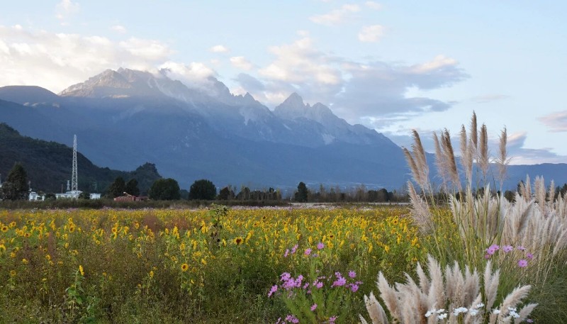 十月,秋高气爽,正是秋游云南丽江的好时节。从束河驶往白沙的路上,一片铺展在雪山脚下的格桑花海映入眼帘。粉的温柔、紫的灵动、白的纯净,还有几株明艳的向日葵点缀其间。风起时,花朵随风摇曳,透着顽强的生命力。