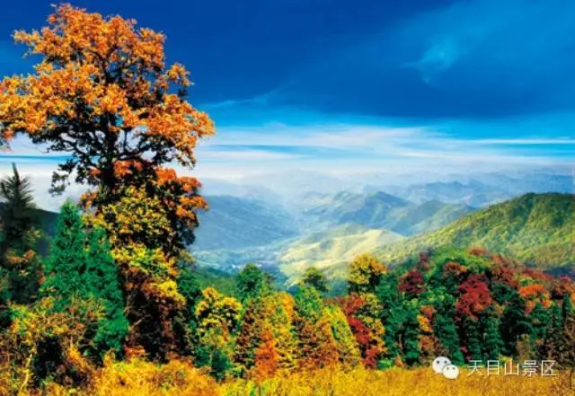天目山秋色是杭州秋色的一绝,湛蓝的天空、清新的空气、温暖的阳光、金黄的银杏、鲜艳的红枫、这里的秋景有许许多多不同。古木丛生的天目山远离了城市雾霾,这里的秋色伴随着时间、气温的逐渐改变,从山顶向山下漫延,美丽异常,犹如一朵秋色花朵在秋日的阳光里娇艳绽放。